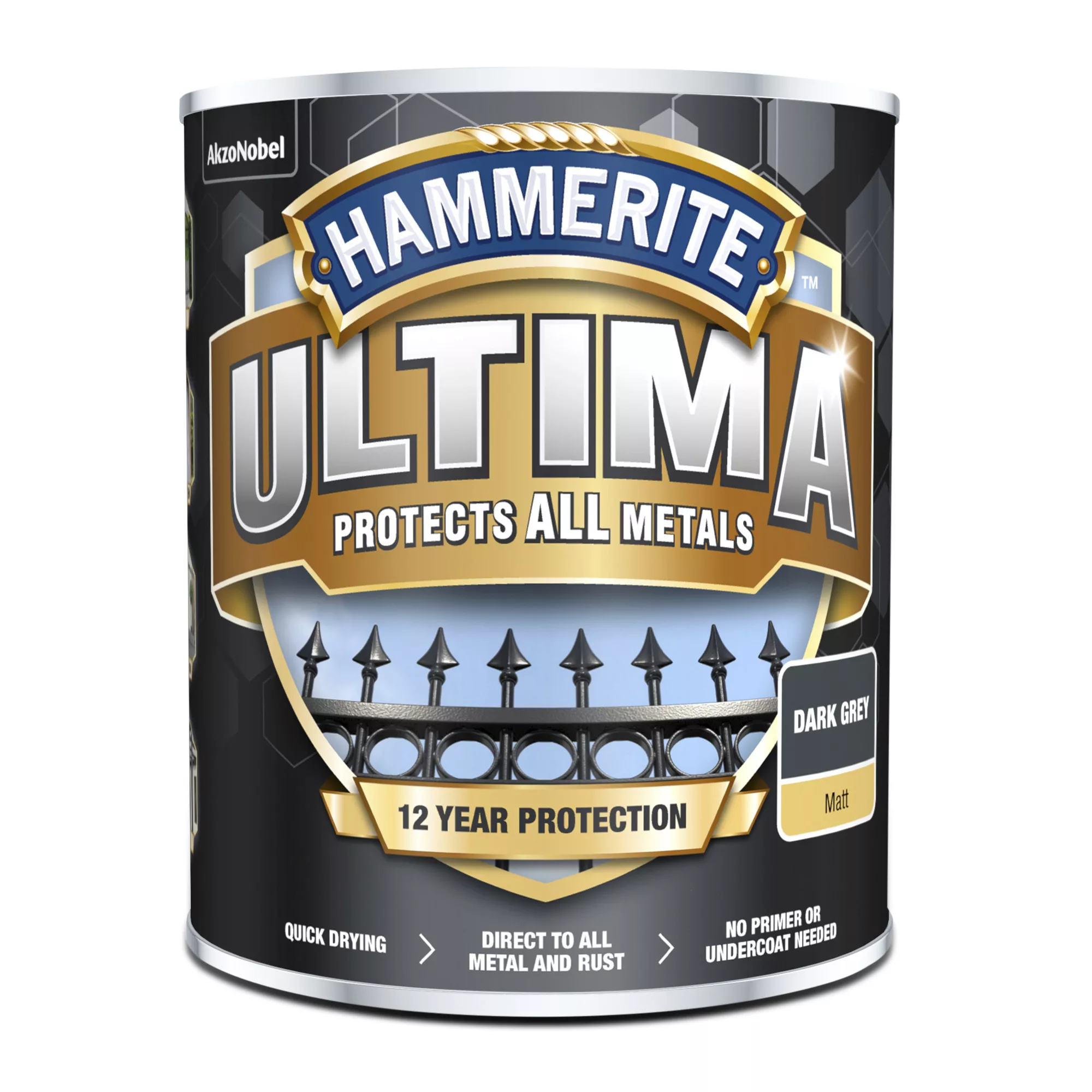 This matt metal paint from the Hammerite Ultima range is the perfect choice to refresh your home exterior. Made to provide a rich, durable finish on multi-surface, you can be sure that this paint will look brilliant for longer. Dark Grey is a stunning shade of grey that will suit any exterior design. The topcoat should be applied on any iron surfaces to create a consistent finish. Ensured to provide a long-lasting matt finish, this metal paint achieves a beautiful look, without compromising on quality. You can buy exactly what you need to complete your decorating job, as this 750ml size will cover up to 7.5 m² on average. For the best outcome, apply using a brush. It will dry quickly between coats meaning you can recoat it in 4 hours. Resistant to water and rust, it’s suitable for use in your outdoor space. Furthermore, you can be assured that this water-based paint is safe for you in your home, as it has minimal VOCs.